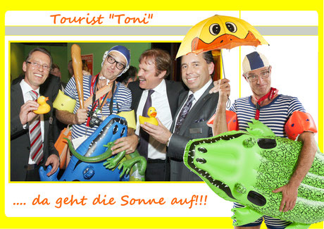Einen Tag wohlverdienten Urlaub hat unser Toni, und ist auf der Suche nach der nächsten Bademöglichkeit. Ein bunter Regenschirm schützt vor der gröbsten Hitze, doch sein Krokodil hat Durst und er bittet um Orientierungs- oder sonstige Hilfe.
